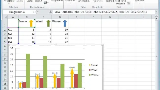 Problem: Ich habe im Excel diverse Energie-Verbrauchszahlen (z.B. Sonne, Wind, Wasser). Nun hätte ich die Verbräuche gerne in Form eines Pfeildiagramms dargestellt. Dabei sollte sich die Grösse der Pfeile automatisch dem Verbrauch anpassen. Geht das?