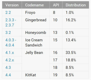 Monatlich veröffentlicht Google Statistiken von Zugriffen auf den Google Play Store. Am weitesten verbreitet ist nach wie vor Android Jelly Bean (Version 4.1 bis 4.3) mit einem Verbreitungsgrad von 61 Prozent. Jelly Bean kam im Juli 2012 raus. Der zweitgrösste Verteilungsgrad von 16,2 Prozent ist dem dreieinhalbjährigen Android 2.3 «Gingerbread» beizumessen. Den dritten Platz belegen, mit 13,4 Prozent, die älteren «Ice Cream Sandwich»-Revisionen 4.03 bis 4.04. Ice Cream Sandwich wurde erstmals im Oktober 2011 veröffentlicht.
