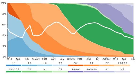 Diese Unmengen an Devices ist eine grosse Herausforderung an die Entwicklergemeinde. Die Entwicklung von nativen Apps wird immer komplizierter. Schuld daran ist auch der Umstand, dass immer noch 8 verschiedene Android-OS-Versionen im Umlauf sind. Wie auf der Grafik unten ersichtlich ist, ist der Android 2.3.x (Gingerbread) nach wie vor hoch, gefolgt von 4.x (Jelly Bean). Diese Grafik deckt sich auch mit den offiziellen Statistiken von Google.