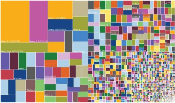 Grundlage für die Grafiken sind 682'000 Android-Geräte, auf welchen die App installiert ist. Dabei kamen über 11'800 verschiedene Devices zum Einsatz - letztes Jahr waren es noch knapp 4000 Geräte, eine Steigerung von beinahe 200%. Die Analysten schreiben auch, dass immer mehr «obskure Geräte» im Umlauf sind.
