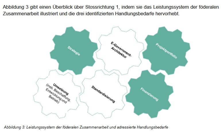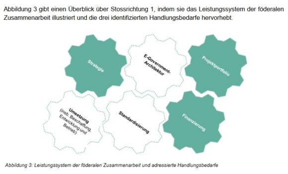 Das Zielbild umfasst zwei Stossrichtungen. Mit Stossrichtung 1 wird die gemeinsame Steuerung und die Zusammenarbeit von Bund, Kantonen, Städten und Gemeinden intensiviert. Im Fokus stehen dabei die weitere Schaffung von Synergien und die Förderung der Interoperabilität durch die gemeinsame Entwicklung von Standards und Architekturen. Parallel wird mit der Stossrichtung 2 eine neue Bundeskompetenz mit spezifischen Regeln zur Mitwirkung der Kantone, Städte und Gemeinden angestrebt, damit künftig wesentliche Standards, wie beispielsweise solche für den Datentransfer zwischen Behörden, für alle Gemeinwesen verbindlich sind.