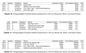 Ebenfalls leicht gestiegen sind die Preise für Breitbanddienste. Ein durchschnittlicher Nutzer muss ungefähr ein Prozent mehr bezahlen. Dieser leichte Anstieg lässt sich mit der Preiserhöhung bei bestimmten Produkten erklären, deren Übertragungsrate heraufgesetzt wurde. Vergleicht man die Preise der dominierenden Anbieter (Swisscom und Cablecom), so ist Cablecom für einen Nutzer mit mittlerem Nutzungsbedarf rund 10 Prozent günstiger als Swisscom. In den Jahren 2009 bis 2012 betrug der Preisunterschied zwischen 20 und 30 Prozent.