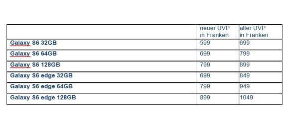 Die Galaxy-S6-Modelle kosten nun 100 Franken weniger: Ein Galaxy S6 mit 32 GB Speicher ist neu für Fr. 599.- statt Fr. 699.- zu haben. Die Galaxy-S6-Edge-Modelle erfahren einen Preissturz von 150 Franken: Ein S6 Edge mit 32 GB Speicher wird zu einem UVP-Preis von Fr. 699.- statt Fr. 849.- ausgerufen.