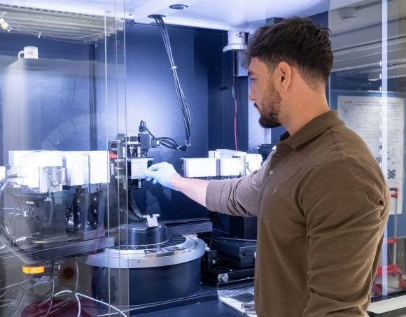 Empa-Forscher Damien Terebenec analysiert die Struktur metallischer Gläser in einem Röntgendiffraktometer.
