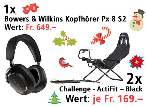 Im Adventskalender 2025 verlost PCtipp auch dieses Jahr wieder tolle Preise. Dazu gehören der Bowers & Wilkins Kopfhörer Px 8 S2 sowie zwei Playseats Challenge - ActiFit - Black.
