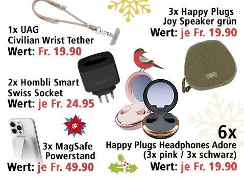 Im Adventskalender 2025 verlost PCtipp auch dieses Jahr wieder tolle Preise. Dazu gehören die Hombli Smart Swiss Sockets, die MagSafe Powerstands, die Happy Plugs Joy Speaker, die Happy Plugs Headphones Adore und das UAG Civilian Wrist Tether.