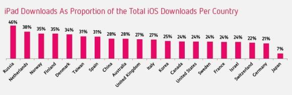 Am stärksten wuchsen die mit den App-Läden erzielten Umsätze in Japan, Russland und China (iOS) respektive in Korea und Japan (Android). Auf das Apple-Universum bezogen ist interessant zu sehen, wie hoch der prozentuale Anteil der iPad-Downloads an den gesamten iOS-Downloads in den verschiedenen Ländern ist. Am höchsten ist dieser Anteil in Russland, wo 46 Prozent aller App-Downloads auf iPads landen. Auch die Niederlande und die skandinavischen Länder Norwegen, Finnland und Dänemark verzeichnen hohe iPad-Anteile zwischen 38 und 34 Prozent. In der Schweiz machen iPad-Downloads nur 22 Prozent aller App-Downloads aus, was der dritttiefste Wert ist. Prozentual noch weniger iPad-Downloads verzeichnen nur Deutschland (21 Prozent) und Japan, das mit 7 Prozent den mit Abstand tiefsten Wert aufweist.