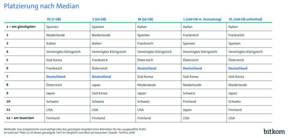 Zum dritten Mal hat der Branchenverband Bitkom eine Studie zu Mobilfunktarifen im internationalen Vergleich erstellen lassen. Untersucht wurden vom Marktforschungsunternehmen Tarifica die Preise in den Flächenländern Deutschland, Finnland, Frankreich, Italien, Niederlande, Österreich, Schweiz, Spanien und Vereinigtes Königreich sowie ausserhalb Europas in Japan, Südkorea und den USA.