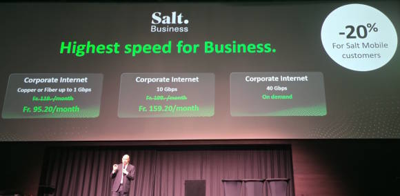 Zu den weiteren Besonderheiten des neuen Salt-Dienstes gehören, so der ISP aus dem Waadtland, aber auch die technischen Kapazitäten, die Kunden ab sofort angeboten werden sollen. Salt setzt konsequent auf die moderne Glasfasertechnologie und bietet im neuen Portfolio Geschwindigkeiten von bis zu 40 Gigabit pro Sekunde an (siehe Bild unten). Dies ist ein Wert, der derzeit (noch) über dem marktüblichen Standard liegt und die Effizienz in der Datenverarbeitung massgeblich steigern soll. Das neue Standbein des Anbieters zeichnet sich durch symmetrische Geschwindigkeiten aus. Das bedeutet, dass Daten ebenso schnell hochgeladen wie heruntergeladen werden können. Für Betriebe, die täglich grosse Backups durchführen oder komplexe Datenmodelle in die Cloud verschieben, ist dies ein wichtiger Punkt wie auch ein Vorteil gegen wiederum ihren Mitbewerbern. Ausserdem Bestandteil des Salt-Pakets sind flexible Telefonielösungen («Corporate Voice»). Letztlich positioniert sich das Unternehmen damit als Vollsortimenter, der die gesamte Kommunikationstechnik aus einer Hand liefert.