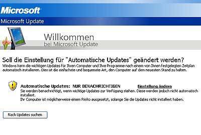Wird die Microsoft-Update-Seite das erste Mal aufgerufen, müssen zuerst verschiedene Komponenten installiert werden. Ausserdem verlangt Microsoft die Absegnung einer Lizenzvereinbarung. Danach kann der Benutzer wählen, ob der Dienst mit den "Automatischen Updates" verknüpft werden soll.