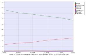 Joomla liegt mit 2,8 Prozent weit abgeschlagen auf Platz zwei, gefolgt von Drupal mit 2,1 Prozent. Auf 57,4 Prozent der Seiten konnte allerdings gar kein CMS erkannt werden. Matt Mullenweg, der Initiator und Chef-Entwickler von WordPress, sieht darin weiter grosse Chancen für sein Blog-System. Drei von vier Seiten verwenden ja noch kein WordPress.