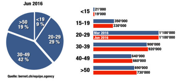 In Relation zur Grafik von Bernet hält sich aber auch bei den Älteren der Zuwachs in Grenzen: Bei den ü50ern waren es im März 2016 noch 690'000 (inzwischen 730'000), was einen Gesamtanteil von 19 Prozent ausmacht. Als grösste Zielgruppe auf Facebook sind noch immer die 30- bis 49-Jährigen mit einem Anteil von 42 Prozent vertreten.