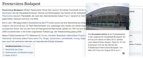 Wikipedia hat eine neue Vorschaufunktion eingeführt. Wer den Mauszeiger über einen blau gefärbten Link zu einer anderen Wikipedia-Seite bewegt, sieht erste Informationen aus dem darunterliegenden Artikel.