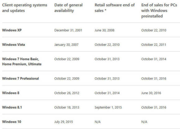 Auf dem Windows Livecycle Fact Sheet, auf dem nicht nur das Ende der Handelsverfügbarkeit des Betriebssystems festgesetzt ist, informiert Microsoft auch darüber, wann der Verkauf neuer PCs mit einer bestimmten Windows-Version ausläuft.