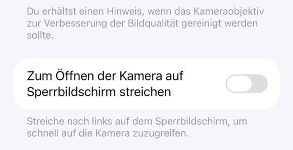 Kein Wunder also, dass eine unscheinbare Neuerung in iOS 26.1 teilweise zu stürmischer Begeisterung führt: In den Einstellungen zu Kamera lässt sich diese Wischgeste nun mit der Option Zum Öffnen der Kamera auf Sperrbildschirm streichen ein für alle Mal aus der Welt schaffen.