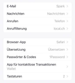 Die Einrichtung der Standard-Apps wird in den Einstellungen des iPhones vorgenommen, und zwar ganz unten im Bereich Apps. Mit einem Tippen auf Standard-Apps öffnet sich eine ganze Liste an Kategorien, bei denen die neuen Zuständigkeiten gesetzt werden können. So wird zum Beispiel 1Password zum alleinigen Herrscher über die Kennwörter.