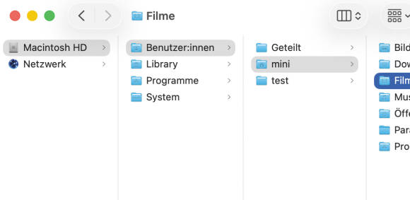 Übersicht. Statt den vollständigen Pfad wie Macintosh HD/Benutzer/pmustermann/ Videos/Ferien aufzufächern, reduziert sich die Angabe auf ~/Videos/Ferien.