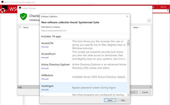 Die Installation ist schnell erledigt. Rufen Sie wscc-app.com/main/downloads.php auf und klicken Sie bei WSCC 64-bit auf Download Now. Starten Sie das Set-up-Programm anschliessend mit einem Doppelklick auf die heruntergeladene EXE-Datei. Im Fenster Setup Type wählen Sie Portable Mode aus und danach den Laufwerkbuchstaben Ihres USB-Sticks. Anschliessend startet WSCC. Beim ersten Aufruf erscheint automatisch der Update Manager. Er informiert über Aktualisierungen und komplette Tool-Sammlungen wie die Sysinternals-Suite, die Sie jetzt auf Ihrem USB-Stick einrichten können, Bild 10. Bestätigen Sie mit Next und Add, um die jeweilige Suite herunterzuladen und auf Ihren Stick zu übertragen. Bei Tool-Sammlungen, auf die Sie verzichten wollen, klicken Sie einfach auf Skip. Sie können sie auch später noch auf Ihren USB-Stick übertragen.