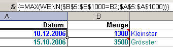 Diese Formel sucht in Spalte B (5:1000) nach dem angegebenen Kriterium in B2 (kleinster Wert) und gibt dann von den vorhandenen Daten in Spalte A (5:1000) das letzte Datum zurück. WICHTIG: Damit die Matrix-Formel korrekt funktioniert, müssen Sie diese mit der Tastenkombination "SHIFT + CTRL + ENTER" abschliessen! Die ganze Formel wird dadurch von geschweiften Klammern umschlossen. Bei der Formel in der Zelle A3 (Datum zum höchsten Wert) ändert sich lediglich das Kriterium, welches jetzt nicht mehr in Zelle B2, sondern in Zelle B3 steht