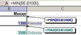 Sie benötigen für die Lösung die beiden Funktionen "MIN" und "MAX". Die normale Verwendung dieser Funktion eruiert in den Zellen B2 und B3 als erstes schon mal den kleinsten (mit "MIN") und den grössten Wert (mit "MAX").