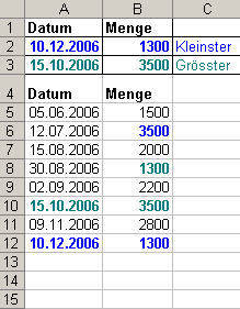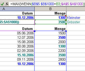 Ich möchte im Excel eine Auslieferungsliste erstellen. In die Spalte A trage ich das Datum ein, in B die an diesem Datum ausgelieferte Stückzahl. Am Beginn der Tabelle soll eine kurze Rekapitulation der Spalten A und B (bis zu 1000 Zeilen) wie folgt dargestellt werden: In Zelle B1 die kleineste bisherige Menge mit dem dazugehörigen Datum in Spalte A1, in Zelle B2 das Datum der ausgelieferten grössten Menge, die in A2 wiedergegeben wird. Bei gleicher Stückzahl (z.B. 1300 Ex am 12. Juli und am 10.Dezember), soll das letzte Datum (10. Dezember) ausgegeben werden.