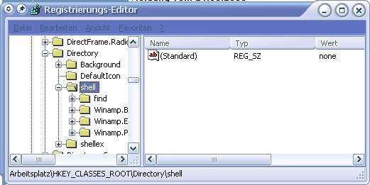 Hier suchen Sie den Eintrag "HKEY_CLASSES_ROOT\Directory\shell". Klicken Sie auf den Eintrag. Im rechten Fenster sehen Sie den Eintrag "Standard".