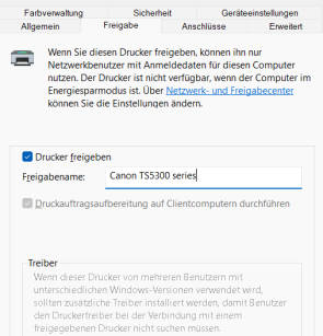 Bei Windows ist die Freigabe eines Druckers recht einfach zu bewerkstelligen. In den Windows-Einstellungen unter Start gehen Sie zunächst zu Bluetooth und Geräte und danach zu Drucker und Scanner. Dort klicken Sie den Drucker an, den Sie im Netzwerk freigeben wollen. Im neuen Fenster navigieren Sie zu den Druckereigenschaften. Im Reiter Freigabe finden Sie die Option Drucker freigeben. Ist diese aktiviert, können Sie zudem einen Freigabenamen festlegen. Optional lassen sich über den Button Zusätzliche Treiber … verschiedene Treiber festlegen, die bei der Installation zur Verfügung stehen sollen. Mit einem Klick auf OK geben Sie den Drucker im Netzwerk frei, Bild 8.