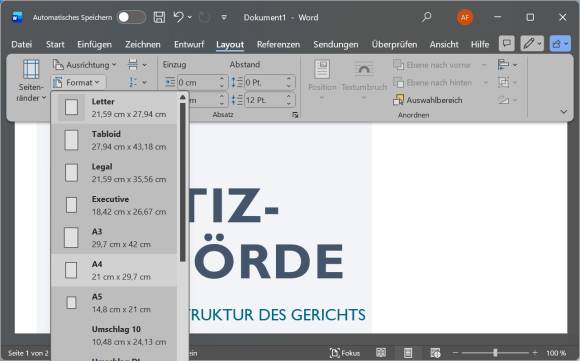 Prüfen Sie ausserdem unter Format, ob überhaupt das richtige Papierformat eingestellt ist. So unterscheiden sich etwa die Formate US-Letter und das hierzulande genutzte DIN A4 zwar nur minimal, beim Ausdruck kann ein falsch eingestelltes Format jedoch zu Fehlern führen, Bild 12.