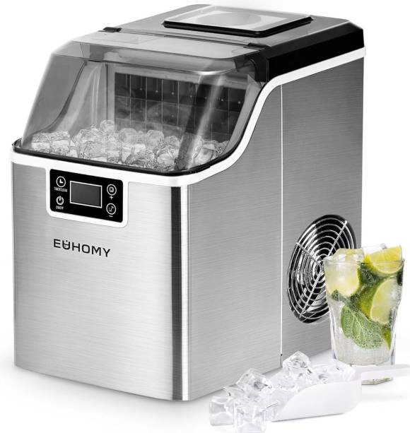 Euhomys ice cube maker ist eine tragbare Eiswürfelmaschine für den Heimgebrauch. Das Modell produziert bis zu 12 Kilogramm Eis pro 24 Stunden, die erste Charge an neun Eiswürfeln wird in schnellen 6 Minuten hergestellt. Insgesamt lassen sich zwei verschiedene Grössen an Eiswürfeln produzieren. Kleine Eiswürfel eignen sich zum Kühlen von Meeresfrüchten und Bier. Grosse sind ideal für Getränke und bieten eine schnelle(re) Kühlwirkung. Der Wassertank hat ein Fassungsvermögen von 1,2 Litern. Das Gerät verfügt über eine automatische Selbstreinigungsfunktion. Die entsprechenden Bedienknöpfe sind an der Vorderseite gut beschriftet angebracht.