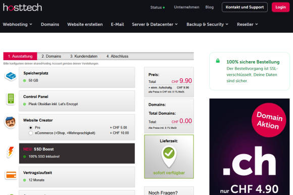Der Anbieter Hosttech bietet auf seiner Homepage eine 30-tägige Testversion seines Website-Creator-Tools an. Nach Ablauf dieser Frist wird die erstellte Webseite automatisch gelöscht. Wer sich für ein kostenpflichtiges Paket entscheidet, erhält wahlweise die Version Pro für Fr. 9.90 pro Monat oder die E-Commerce-Version für Fr. 14.90 pro Monat, die einen Onlineshop, eine unlimitierte Anzahl an Seiten und Mehrsprachigkeit beinhaltet. In beiden Paketen sind 50 GB Speicherplatz, das Control-Panel und Basis-Support enthalten. Der Serverstandort befindet sich in der Schweiz, die Vertragslaufzeit beträgt ein Jahr.