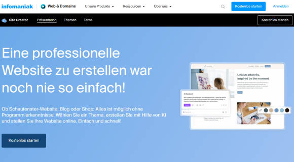 Infomaniak hat mit seinem Site Creator einen Webbaukasten im Angebot, der explizit KI-gestützt ist. Das Tool ermöglicht es, eine Homepage, einen Blog oder einen Shop mithilfe von KI zu erstellen. Die künstliche Intelligenz generiert dabei die Website, ohne dass man eine einzige Zeile Code schreiben muss. Diese Unterstützung vereinfacht den Prozess erheblich und eignet sich gut für Anfänger.