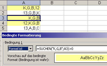 Verwenden Sie die Bedingte Formatierung mit der folgenden SUCHEN-Formel: "=SUCHEN("K,G,B";A3)>0"