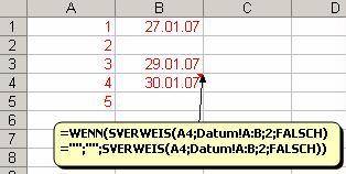 Entsprechend ihrer Kummerkasten-Meldung 18628 versuche ich in einer Excel-Zelle die Datums-Information einer anderen Tabellen-Zelle zu importieren. Irgendwie scheint ein Fehler vorhanden zu sein, denn bei Eingabe der Werte entsprechend der Vorgabe für Zelle B4 =WENN(SVERWEIS(A4;Datum!A:B;2;FALSCH) =““;““;SVERWEIS(A4;Datum!A:B;2;FALSCH)) wird diese Formel nicht akzeptiert und zugleich darauf hingewiesen, dass die Position =““; fehlerhaft ist und #BEZUG. Wo liegt die Lösung dieses Rätsels?