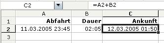 Ich möchte mit Excel folgendes berechnen: Abfahrtszeit mit Datum ist gegeben, dazu wird die Fahrtzeit eingegeben. Abfahrtszeit und Fahrtzeit sind zu addieren und ein Enddatum mit Endzeit soll ausgegeben werden. Es fuktioniert schon fast, jedoch fehlen immer ein paar Stunden. Die Formel: =ZEIT(STUNDE(A1);MINUTE(A1)+(b1);SEKUNDE(0))