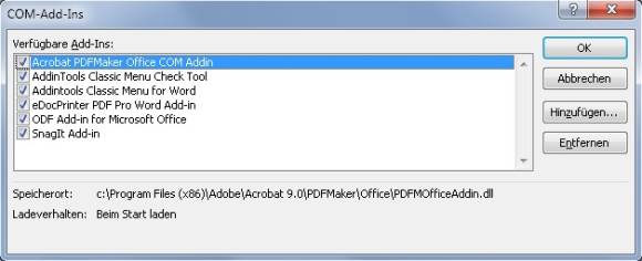 Lösung: Die Ursachen für solche Probleme liegen sehr häufig in zusätzlich installierten Add-Ins. Die kommen oft zusammen mit anderen Anwendungen mit, z.B. mit solchen von Adobe.