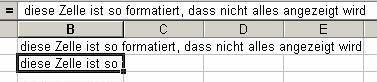 Der Inhalt kann sich auch über mehrere Zellen verteilen, sofern diese leer sind. Im folgenden Beispiel sind die Nebenzellen in Zeile A leer, in Zeile B jedoch mit einem Leerschlag (was auch als Zeichen gilt) gefüllt. In Zeile B wird also nicht mehr der gesamte Inhalt angezeigt, weil dort nicht die Formatierung "Zeilenumbruch" eingestellt ist.