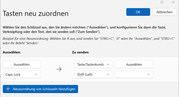 - Ebenfalls hilfreich ist der Tastatur-Manager. Mit ihm belegen Sie beispielsweise die Caps-Lock-Taste um. So können Sie nicht mehr versehentlich daraufkommen und ohne es zu bemerken, in Grossbuchstaben weiterschreiben. Um das zu beenden, klicken Sie auf Einstellungen öffnen und danach auf Taste neu zuordnen sowie auf Neuzuordnung von Schlüsseln hinzufügen. Klicken Sie links auf Auswählen. Drücken Sie die Shift-Taste. Bestätigen Sie mit OK und wiederholen Sie den Vorgang mit der rechten Auswählen-Schaltfläche. Drücken Sie hier die normale Shift-Taste und bestätigen Sie mit OK. Klicken Sie oben rechts auf OK und auf Vorgang dennoch fortsetzen, Bild 3. Damit haben Sie die Caps-Lock-Taste entschärft.