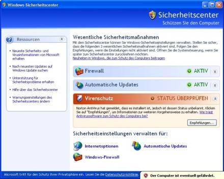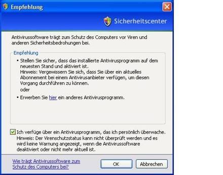 Das Service Pack 2 von Microsoft Windows XP verfügt über eine Firewall, welche standardmässig aktiviert ist. Allerdings ist in Service Pack 2 kein Antiviren Programm enthalten. Nach der Installation von Service Pack 2 erhalten Sie in der Systemsteuerung ein neues Icon mit dem Namen Windows-Sicherheitscenter.