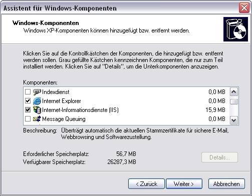 Die Komponenten, diee in den meisten Fällen benötigt werden, sind in den Windowsversionen bereits vorhanden. Bei der Serverversion werden sie standardmäßig gleich beim Aufsetzen installiert. Bei Windows XP lassen sich die Komponenten in der Systemsteuerung unter "Software/Windows-Komponenten" nachinstallieren.