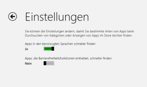 Gehen Sie via Startbildschirm zum Store. Fahren Sie mit der Maus ganz an den rechten Bildschirmrand, öffnen die Einstellungen und darin erneut Einstellungen. Stellen Sie sicher, dass «Apps in den bevorzugten Sprachen schneller finden» auf Ja steht; andernfalls ändern Sie das.
