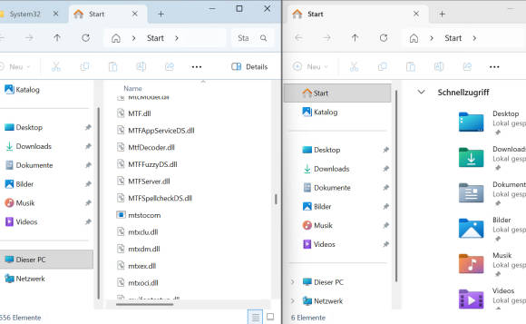 Die Tabs sind nicht schlecht und waren auch eine von vielen Nutzern lang erwartete Neuerung. Zwei Ordner nebeneinander zeigt der Windows-Explorer aber trotzdem immer noch nicht an. Zwar können Sie mit den Snap-Layouts von Windows 11 leicht zwei Explorer-Fenster nebeneinander anordnen, Bild 11. Dabei müssen Sie aber meist die Spalten noch selbst von Hand anpassen. Viele Anwender greifen daher lieber gleich zu einer Alternative wie der in der Schweiz entwickelten Dateimanager-Alternative Total Commander.
