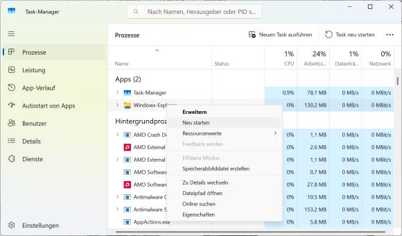 Klicken Sie im Anschluss in Windows mit der rechten Maustaste auf Start und wählen Sie Task-Manager aus. Windows-11-Nutzer suchen auf dem Reiter Prozesse nach dem Eintrag Windows-Explorer und klicken mit der rechten Maustaste darauf. Wählen Sie Neu starten aus, Bild 10.