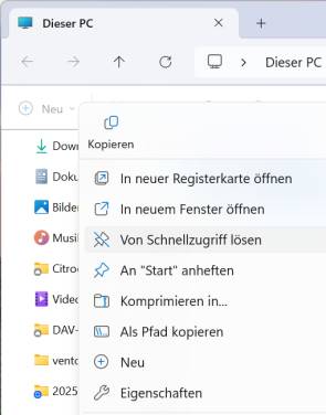 Standardmässig zeigt der Windows-Explorer sowohl unter Windows 10 als auch unter Windows 11 als Erstes den Schnellzugriff. Hier listen beide Windows-Versionen zuletzt verwendete sowie häufig genutzte Ordner auf. Per Rechtsklick und Von Schnellzugriff lösen entfernen Sie überflüssige Einträge aus der Liste, Bild 2. Umgekehrt können Sie einen wichtigen Ordner auch per Rechtsklick und An Schnellzugriff anheften zur Schnellzugriff-Liste hinzufügen.