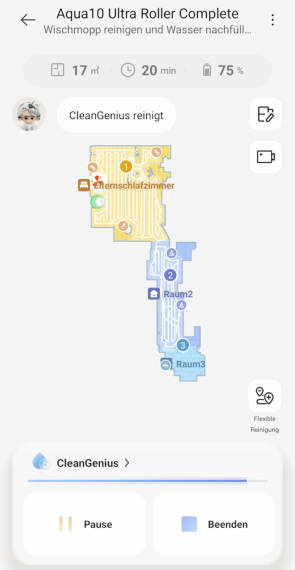 Danach haben wir, im ersten Schritt, den Sauger per zugehöriger Dreamehome-App und über WLAN-Anbindung mit dem Handy verbunden. Die App ist zwar optional, bietet jedoch einen deutlich grösseren Komfort und auch notwendige Kontrolle über die Reinigungszonen, die Erstellung der digitalen Raumkarte und die Verwaltung der Reinigungsmodi, wie etwa das Festlegen von Wisch- und Saugsperrzonen. Top: Das Design der App und die klaren Ansagen des Roboters führen den Nutzer rasch durch die ersten Schritte, sodass das Gerät zügig einsatzbereit ist. Nach der Einrichtung über den Schritt-für-Schritt-Assistenten nimmt etwa 5 bis 10 Minuten in Anspruch. Danach beginnt der Roboter bei seinem ersten Reinigungsdurchgang automatisch mit der Kartierung der Wohnung, wobei das LiDAR-System die Raumstruktur erfasst und speichert. Noch ein Tipp: Das Eigengewicht des Roboters und der befüllten (!) Station ist nicht unerheblich; ein häufiges Umstellen der Basisstation in andere Stockwerke ist daher eben mit Aufwand verbunden.