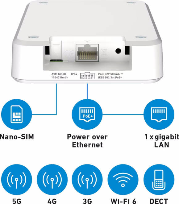 Details: 5G-Router, WiFi 6 (max. 3000 Mbit/s), NanoSIM, Mesh, Telefonanlage, Smarthome-Funktionen, Gbit-LAN, PoE+, IP54, 5 Jahre Garantie