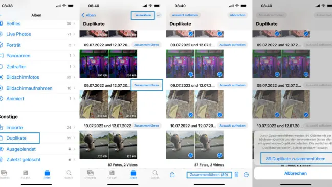 Doppelte Selfies, den QR-Code fürs Konzert versehentlich gescreenshottet – so füllt sich die Bildergalerie. So können Sie unter iOS16 in Sekunden und völlig kostenlos Duplikate löschen.