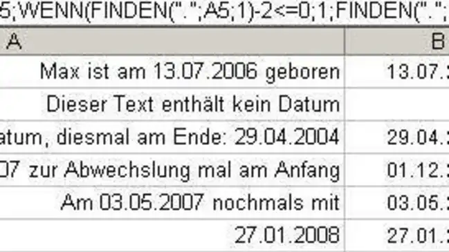 Spalte A enthält Texte mit Kalenderdaten (z.B. «Das Kind ist am 13.07.2006 geboren»). Wie kann man aus dem Text das Datum oder den Wochentag extrahieren?