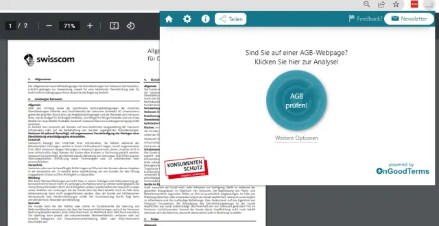 Quelle: Screenshot/PCtipp.chAnfang 2023 wurde das Online-Tool durch eine kostenlose Browsererweiterung ergänzt, die für Firefox und Chrome erhältlich ist. Beim Onlineshopping werden Sie davon auf AGB aufmerksam gemacht. Sie können diese direkt analysieren und sehen sofort, ob ein Abo automatisch verlängert wird, ob Widerrufsrechte fehlen oder die Rücksendekosten nicht übernommen werden. Bei einem kurzen Versuch mit den Wingo-AGB (gehört zu Swisscom) fand das Add-on 2 Klausen, die die Kündigung betreffen.