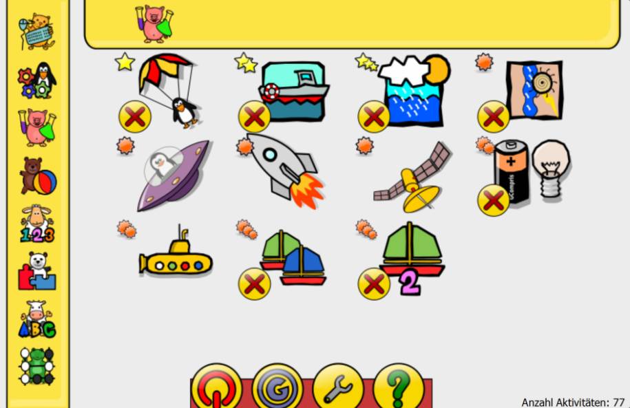 Erste Schritte: Wählen Sie zwischen Zählen, Grundrechenarten, Leseübungen oder Aufgaben wie Länder auf einer Karte anzuordnen. Dies führt spielend in den schulischen Bereich. Knobelspiele, Puzzles aus berühmten Gemälden, Zeichnen oder Memory dienen eher der Entspannung. Darüber hinaus werden Geräte und Vorgänge wie eine Schleuse, der Wasserkreislauf oder ein U-Boot erklärt und begreifbar gemacht.