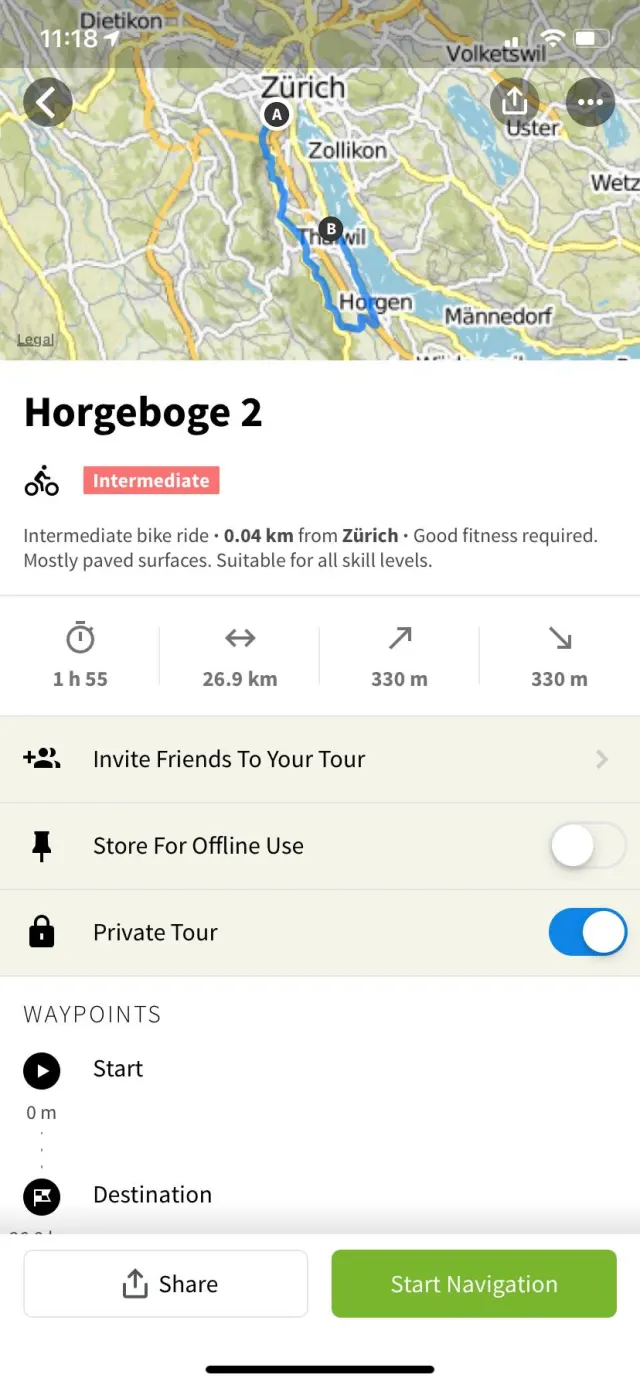 Fügen Sie weitere Wegpunkte hinzu, bis Sie mit der Route zufrieden sind. Dann verfrachten Sie die Route am besten auf ein mobiles Gerät, damit Sie nicht alles auswendig lernen müssen. Mit einem Komoot-Konto können Sie die Route einfach mit dem «Speichern»-Knopf zu Ihrem Nutzerkonto hinzufügen. Installieren Sie dann auf Ihrem Smartphone die Komoot-App und loggen Sie sich ein. Im Abschnitt «Profil», dann «Routen», finden Sie alle von Ihnen geplanten und absolvierten Routen. Öffnen Sie die gewünschte Route und tippen Sie unten auf «Navigation starten», um Komoot als Navigationsgerät zu verwenden. Mit der Schaltfläche «Für Offlinegebrauch speichern», können Sie die Route herunterladen und auch ohne Internetverbindung verwenden. Dafür ist jedoch der Kauf der jeweiligen Kartenregion nötig. Mehr dazu weiter unten in diesem Artikel.